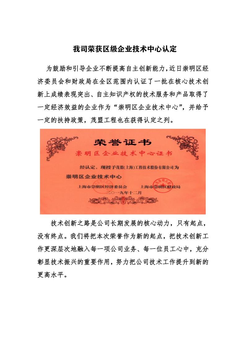 我司荣获区级企业技术中心认定